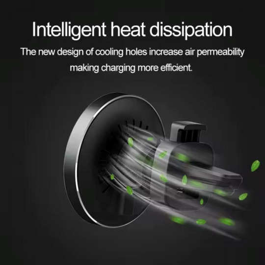 Q22 CAR Kvalitní hliníková výkonná bezdrátová magnetická nabíječka do auta s podporou Apple MagSafe. Vybavená držákem do ventilace, v atraktivním černo transparentním designu.