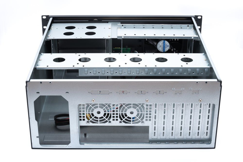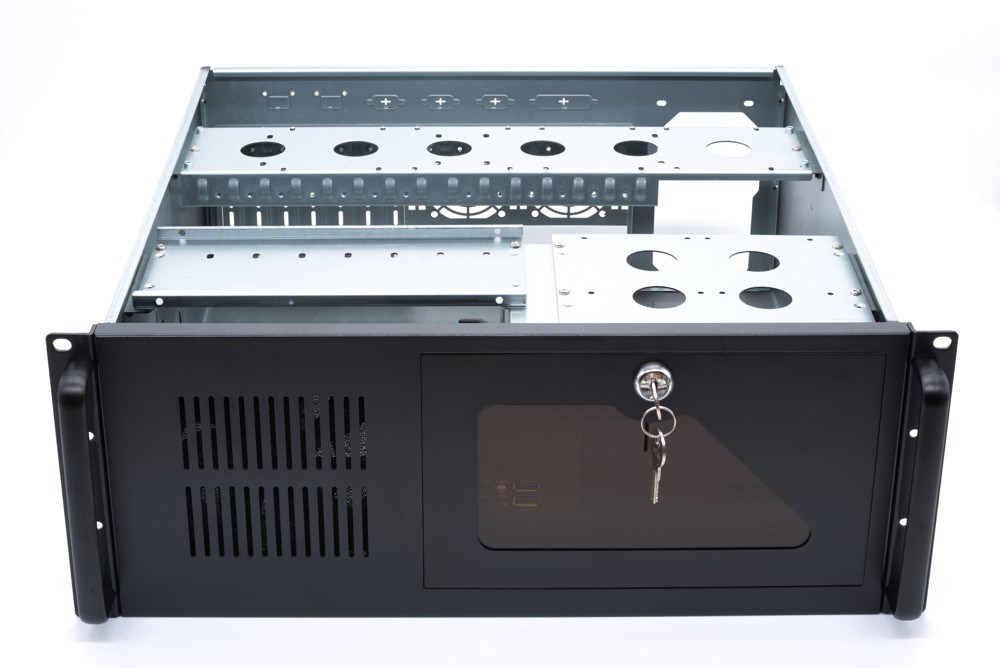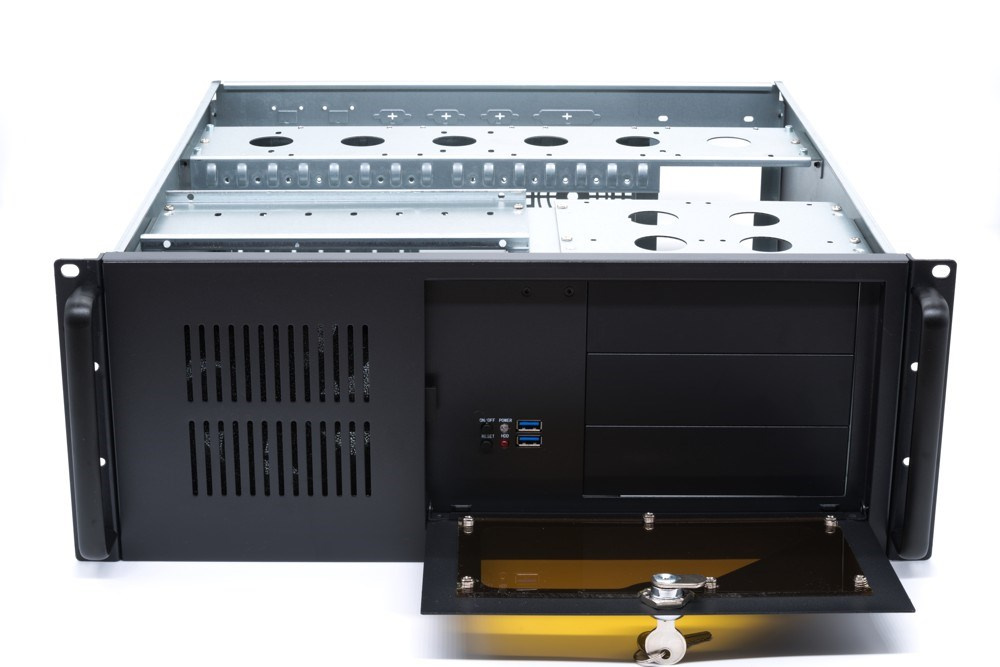 IPC 4U-450 je velice kvalitní serverová skříň určená pro montáž do rackového rozvaděče 19". Skříň je vyrobena z plechu o dnes již málo vídané sile 1,2mm. Čelní panel je zakryt odklopnými plechovými dvířky s možností uzamčení. Při zavřeném panelu jsou viditelné pouze indikační LED přes průhlednou část dvířek. Po odklopení dvířek jsou k dispozici ostatní ovládací prvky.
