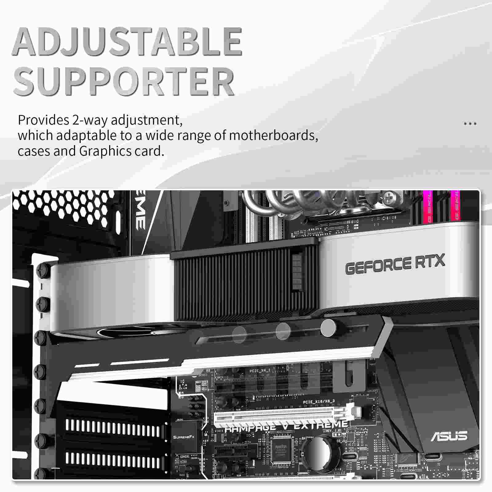 Stylová varianta této opory Vaší grafické karty je vyrobena z ocelového práškově lakovaného plechu a plastu, zabraňuje prohýbání větších karet ve slotu a dodává tak sestavě lepší celkovou stabilitu. Součástí je silikonová posuvná opora, kterou lze posunout jak horizontálně tak i vertikálně a umožňuje instalaci v různých místech karty, pro maximální kompatibilitu s většinou karet. Rozměry držáku jsou 280 x 52mm.