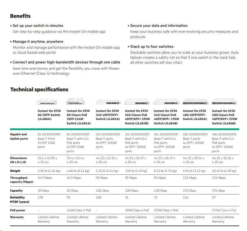 | Device Management | Aruba Instant On Cloud; Web browser; SNMP Manager | |