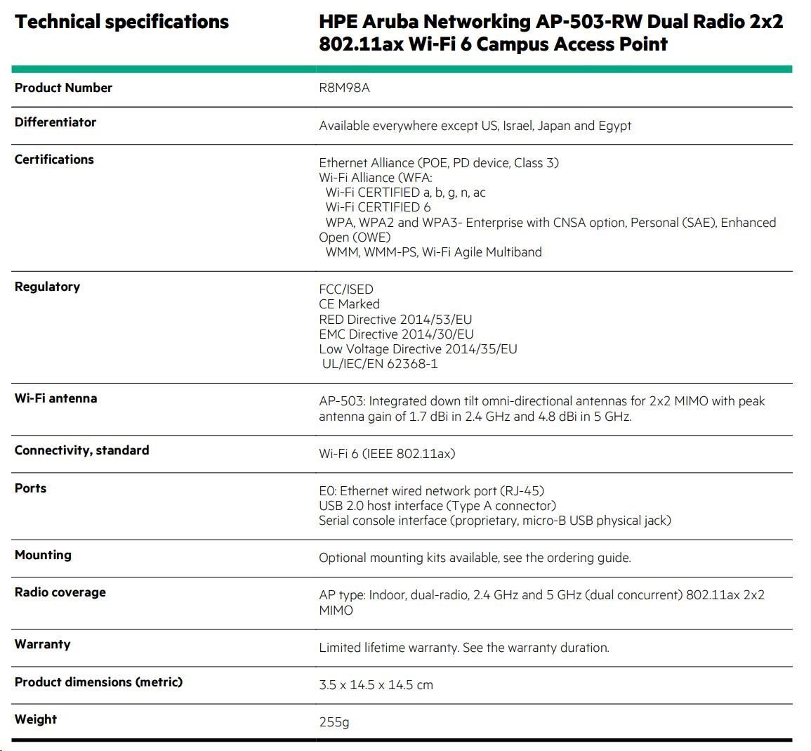 5 x HPE Aruba Networking AP-503-RW Dual Radio 2x2:2 802.11ax Wi-Fi 6 Campus Access Point ( 5x R8M98A )