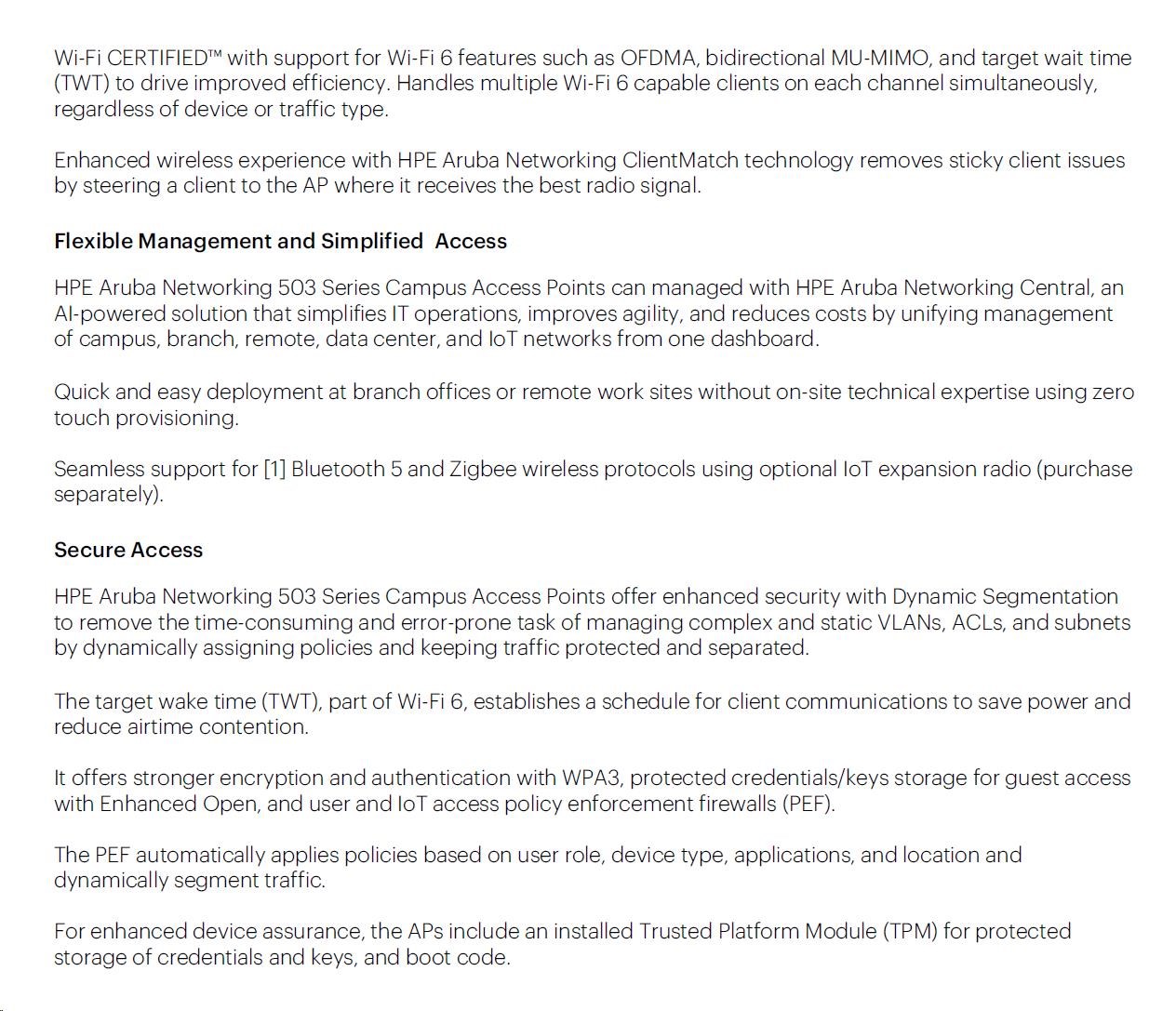 The Aruba 503 Series supports a Zero Trust/Secure Access Service Edge (SASE) architecture to better protect user authentication and wireless traffic. Select capabilities include:
