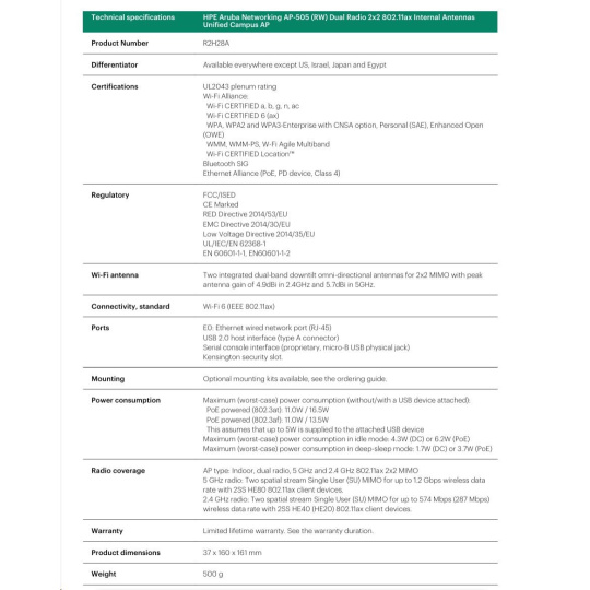 Odkaz na web výrobce: https://www.arubanetworks.com/assets/ds/DS_AP500Series.pdf