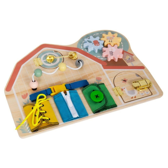 Activity board v podobě farmy zavede holčičky i chlapce na venkov, kde si pohrají s hracími prvky a osvojí si pár praktických dovedností. Activity board s ozubenými koly, korálkovým bludištěm, dvířky a okýnkem, různými zámky a různými způsoby zapínání vede děti k samostatnosti ve hře, v poznávání a učení se, v oblékání..