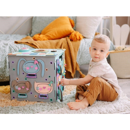 Originální activity board kostka s LED osvětlením XXL je montessori hračkou, která dětem přinese spoustu zábavy, zdokonalí jejich schopnosti a naučí je novým dovednostem. Každá ze stran modrého activity boardu je originální a nabízí nespočet možností ke hře, poznávání a zkoumání. Nechybí ozubená kolečka, různé způsoby zapínání a zavírání, tkanička, bludiště, korálky, vkládací puzzle, různá překvapení i sluníčkový vypínač, který activity board kostku rozzáří..