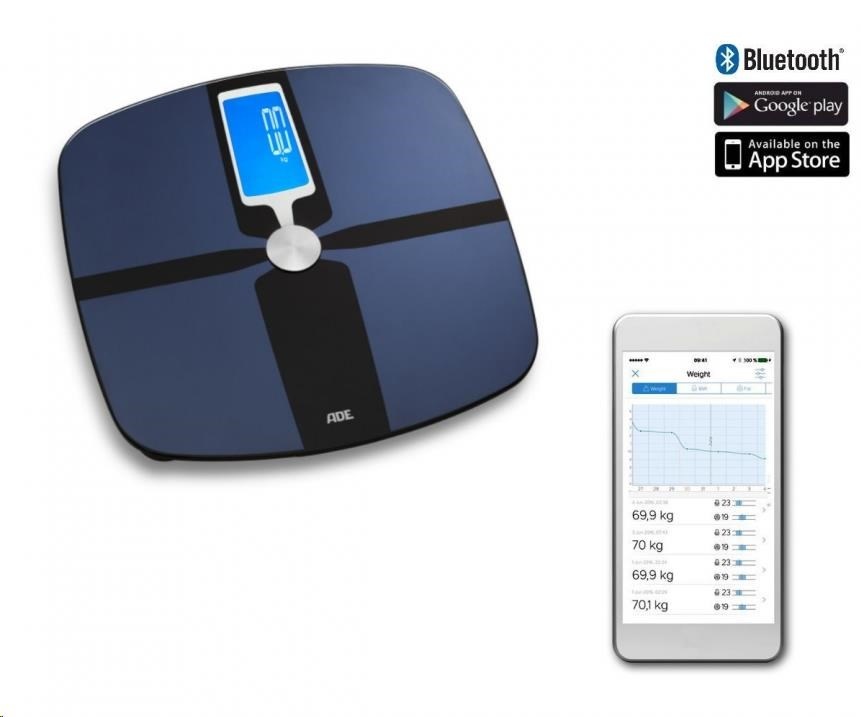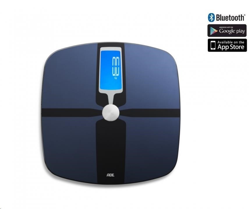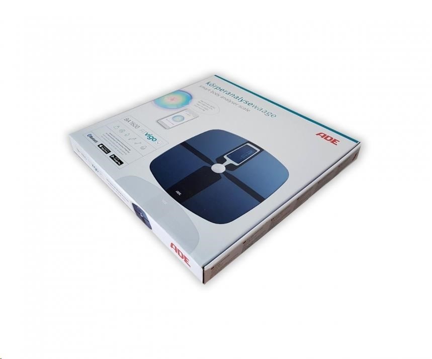 Diagnostická osobní váha ADE BA 1600 FITvigo s bluetooth má nosnost do 180 kg s rozlišením 100 g. Povrch je skleněný se speciální úpravou, váha má osvětlený inverzní displej a paměť pro 8 uživatelů. Možný je přenos naměřených dat do mobilního zařízení přes bluetooth. Zobrazení a ukládání naměřených dat pomocí aplikace FITvigo v mobilním zařízení, nebo na serveru ADE.