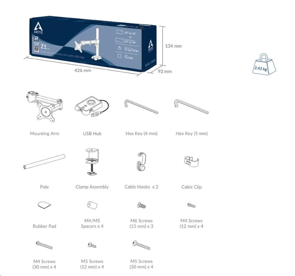 ARCTIC stolní držák Z1 (Gen.3) pro 1x LCD do 43", nosnost 15kg, USB HUB, černý (black)