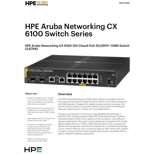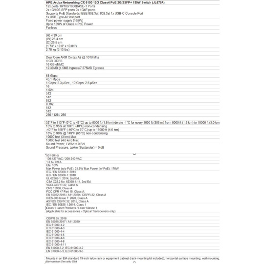 Aruba 6100 12G Class4 PoE 2G/2SFP+ 139W Switch JL679A RENEW.