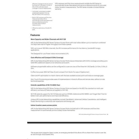 In addition, Aruba's Wi-Fi 6 and 6E APs support Open Locate, an emerging standard that allows APs to share their location over the air and through cloud-based APIs, enabling mobile devices to locate themselves and applications to support network analytics.