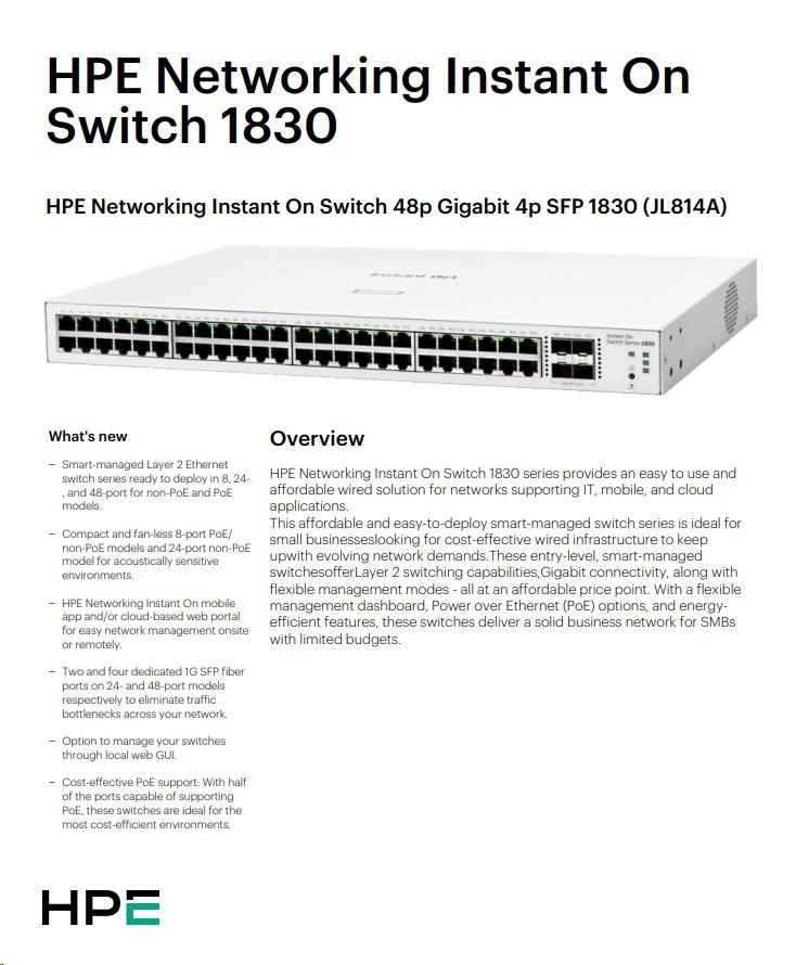 | Aruba Instant On 1830 8G Switch (JL810A) | Aruba Instant On 1830 8G 4p Class4 PoE 65W Switch (JL811A) | Aruba Instant On 1830 24G 2SFP Switch (JL812A) | Aruba Instant On 1830 24G 12p Class4 PoE 2SFP 195W Switch (JL813A) | Aruba Instant On 1830 48G 4SFP Switch (JL814A) | Aruba Instant On 1830 48G 24p Class4 PoE 4SFP 370W Switch (JL815A) | ||||||||