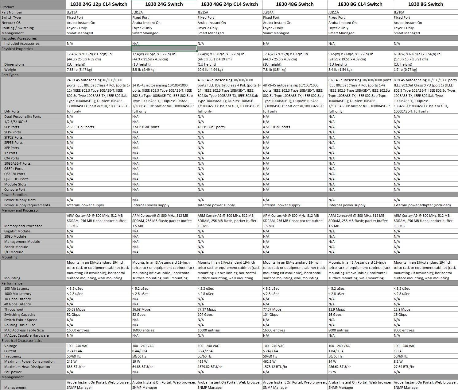 | Aruba Instant On 1830 8G Switch (JL810A) | Aruba Instant On 1830 8G 4p Class4 PoE 65W Switch (JL811A) | Aruba Instant On 1830 24G 2SFP Switch (JL812A) | Aruba Instant On 1830 24G 12p Class4 PoE 2SFP 195W Switch (JL813A) | Aruba Instant On 1830 48G 4SFP Switch (JL814A) | Aruba Instant On 1830 48G 24p Class4 PoE 4SFP 370W Switch (JL815A) | ||||
