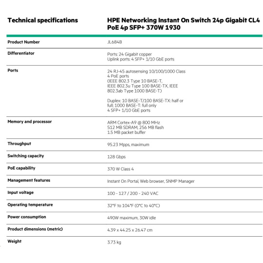 HPE Networking Instant On Switch 24p Gigabit CL4 PoE 4p SFP+ 370W 1930 (JL684B)