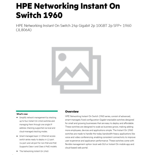 | In today's digital-first environment, small businesses face many challenges to stay afloat and competitive. With tight budgets and limited technical expertise, they're struggling to keep up with the explosion of devices and bandwidth-heavy applications running on the network. To optimize both performance and investment, small businesses need cost-effective, next-gen networking solutions. The Aruba Instant On 1960 Switch Series is an easy-to-use and affordable wired solution for networks supporting IT, mobile and cloud applications. Aruba Instant On 1960 Switches are advanced, smart-managed, fixed configuration Gigabit stackable switches designed for small and growing businesses that are easy to deploy and affordable. These switches are designed to scale as business grows, making adding more employees, devices and applications simple. Aruba Instant On 1960 switches are made to handle today's bandwidth-heavy applications like voice and video conferencing, enabling consistent connectivity to improve user experience and application performance.