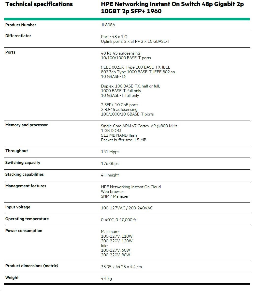 HPE Networking Instant On Switch 48p Gigabit 2p 10GBT 2p SFP+ 1960 (JL808A).