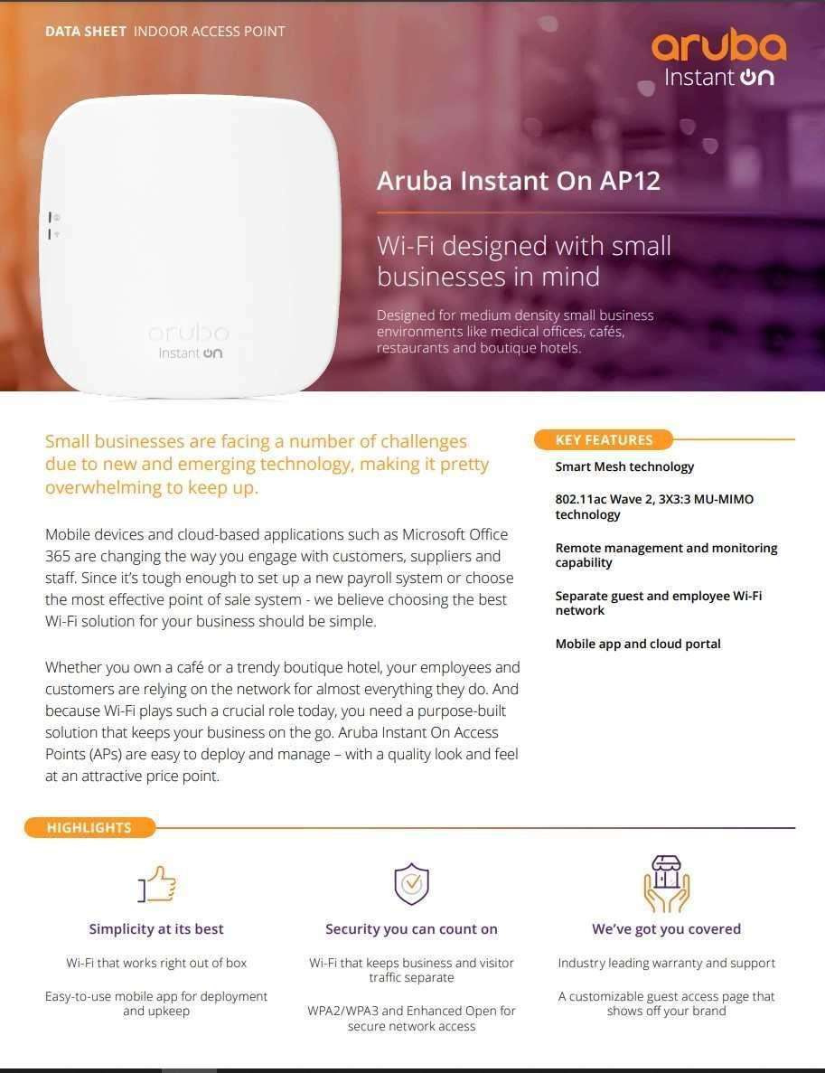 Whether you own a café or a trendy boutique hotel, your employees and customers are relying on the network for almost everything they do. And because Wi-Fi plays such a crucial role today, you need a purpose-built solution that keeps your business on the go. Aruba Instant On Access Points (APs) are easy to deploy and manage-with a quality look and feel at an attractive price point.