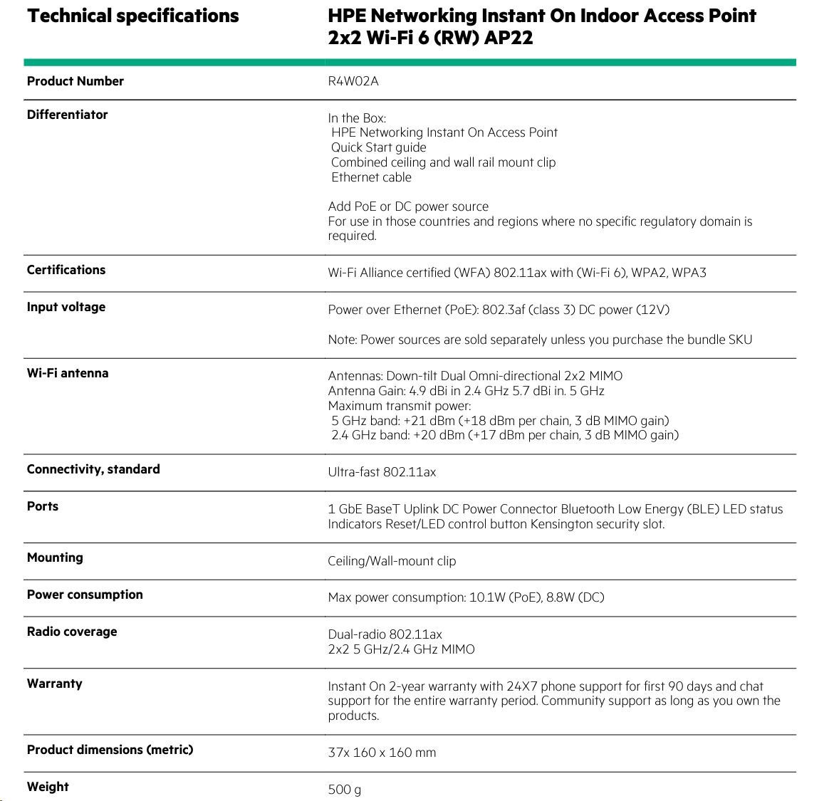 Small businesses are facing a number of challenges—challenges that need constant attention. The right technology can help you stay on top of them and stay ahead of the curve. Technologies like the ones found inside the AP22. To meet the increasing needs and volumes of connected devices, Aruba Instant On is announcing its first Wi-Fi 6 access point: AP22. Delivering higher capacity and greater performance at a competitive price, the AP22 is the perfect access point for small businesses with expanding mobile, cloud, and IoT requirements. Wi-Fi Certified 6TM AP22 access points deliver faster Wi-Fi speeds, greater capacity, and reduced latency between access points and devices for a superior Wi-Fi experience. With the AP22, you can upgrade your Wi-Fi network to boost performance across devices now, while preparing it for more mobile and IoT devices in the future. Already have a demanding mobile and/or IoT environment? Delivering 4x the capacity of 802.11ac access points, AP22 can provide an exceptional user experience in a broad variety of scenarios. Remote offices. Hybrid classrooms. Hotels and restaurants. Reimagined retail and hospitality. The AP22 can handle them all without breaking a sweat. Want to make wires a thing of the past? Combine the AP22 with Smart Mesh Wi-Fi for complete wireless coverage. Want to keep bandwidth hogs and unknown devices off your network? Banish them with the flip of your thumb on the Aruba Instant On App. We know the critical role Wi-Fi plays in business today. No business can’t afford downtime. The Aruba Instant On AP22, at every level, is designed for rapid deployment and simplified management. Be it mounting hardware, or remote device management, or having access to the latest business-grade software, the AP22 lives to make your life easier. |