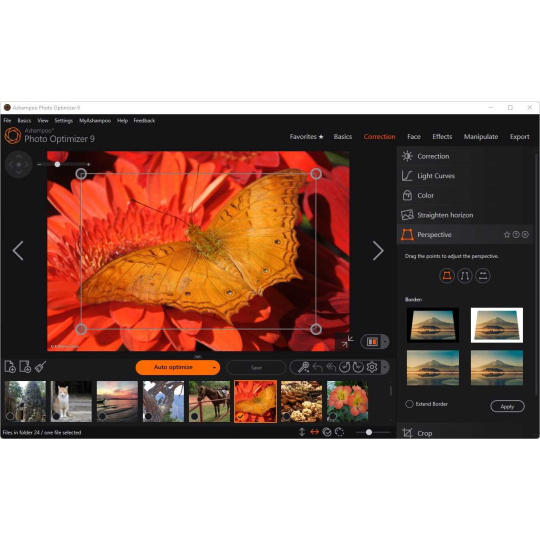 Při pořizování snímků budov často dochází k nepříjemnému a snadno patrnému zkreslení perspektivy, které je způsobeno polohou fotografa. Budovy a jiné vysoké objekty jako by se převracely, což vašim fotografiím dodává nechtěný komický nádech. Jindy jste si zapomněli vzít stativ a nepodařilo se vám udržet fotoaparát zcela rovně. Vstupte do nové funkce korekce perspektivy aplikace Photo Optimizer! Opravte horizontální nebo vertikální zkreslení na několik kliknutí a zachraňte snímky, které by jinak putovaly rovnou do koše. Dejte svým fotografiím druhou šanci a získejte vždy správnou perspektivu!