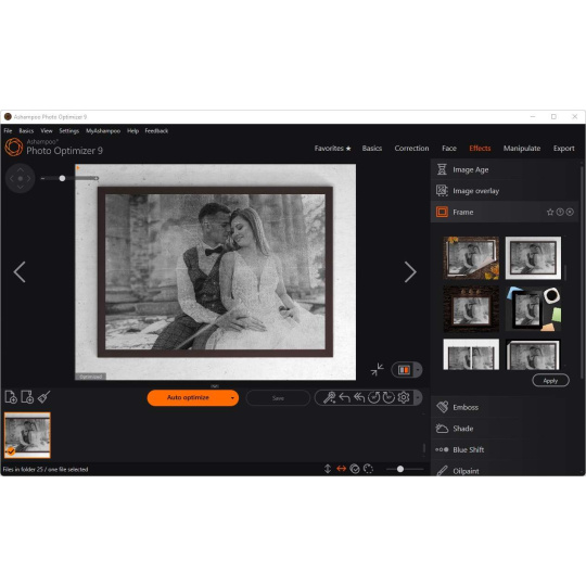 Ashampoo Photo Optimizer samozřejmě obsahuje všechny obvyklé funkce, jako je ořezávání, otáčení, vodoznaky a změkčování obrázků. Ale tím to nekončí. Nebojte se kreativního přístupu k uměleckým efektům a elegantním návrhům rámečků. Ať už obnovujete nepovedené snímky, zvyšujete kvalitu snímků o dalších 5 % nebo se jen bavíte, tento program je pro vás ten pravý!