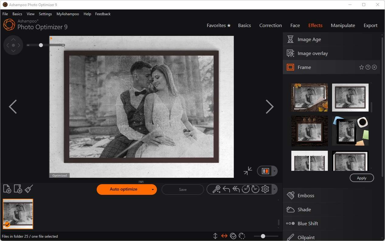 Ashampoo Photo Optimizer samozřejmě obsahuje všechny obvyklé funkce, jako je ořezávání, otáčení, vodoznaky a změkčování obrázků. Ale tím to nekončí. Nebojte se kreativního přístupu k uměleckým efektům a elegantním návrhům rámečků. Ať už obnovujete nepovedené snímky, zvyšujete kvalitu snímků o dalších 5 % nebo se jen bavíte, tento program je pro vás ten pravý!
