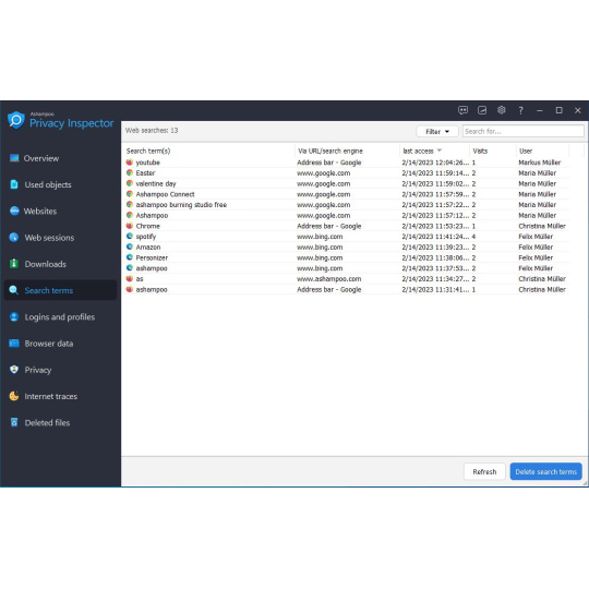 Mějte plnou kontrolu nad historií stahování a vyhledávání. Online zdroj, velikost souboru, doba stahování - s Ashampoo Privacy Inspector máte všechny potřebné informace na dosah ruky - nejen vy, ale i všichni ostatní, kteří používají váš počítač! Ale žádné obavy, vestavěné filtry vám pomohou identifikovat a během okamžiku odstranit citlivé informace. Chcete se vrátit na nedávnou stránku, ale zapomněli jste, jak se na ni dostat? Ashampoo Privacy Inspector vám pomůže i s tím!