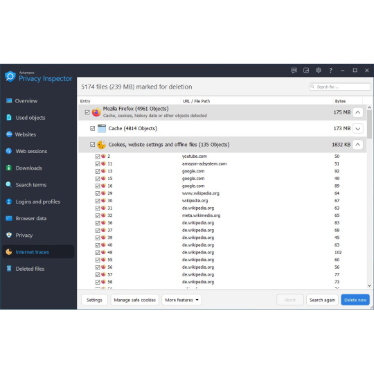 Někdy se stane, že si potřebujete zopakovat své poslední aktivity na internetu. Jak jste se dostali na danou stránku a co jste na ní hledali? Ashampoo Privacy Inspector vám pomůže analyzovat webové relace pomocí rozsáhlého seznamu nebo stromového zobrazení, které zahrnuje všechny vaše online aktivity. Oživte svou historii prohlížení webu a už nikdy neztraťte nit.