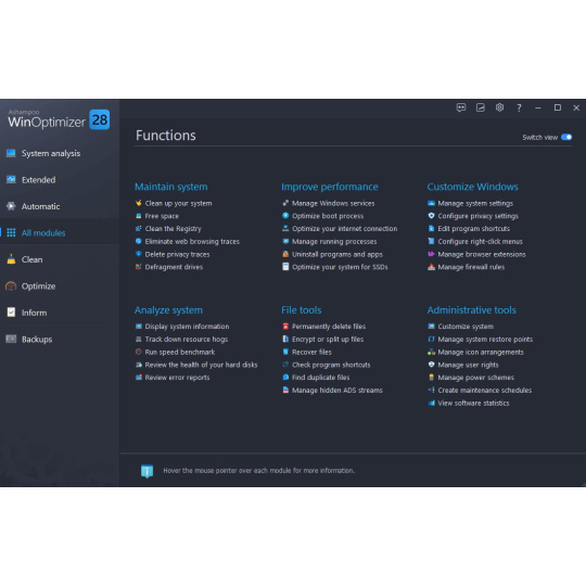 S novým programem Ashampoo WinOptimizer 28 získáte automaticky nejlepší zážitek z práce s Windows. Jeho nová automatizace zrychluje, čistí a ladí vaše aplikace. Nechte svůj počítač plynule přizpůsobit vašim potřebám pomocí prioritizace procesů, automatického čištění dočasných souborů a vlastních konfigurací profilů na základě nového nástroje Profile Booster. Ať už jde o hraní her, práci nebo prohlížení webu, maximalizujte výkon systému nebo šetřete prostředky, volba je na vás. Nový nástroj Crash Analyzer nabízí hluboký pohled na pády systému a jejich příčiny, zatímco čtyři pokročilé čističe zajišťují soukromí a poskytují údržbu systému. Díky vylepšené správě paměti dokáže nyní WinOptimizer využít více prostředků k provádění komplexních analýz téměř okamžitě!