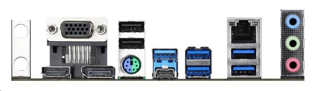 | Rear panel I/O | - Antenna Bracket - 1 x PS/2 Mouse/Keyboard Port - 1 x D-Sub Port - 1 x HDMI Port - 1 x DisplayPort 1.4 - 1 x USB 3.2 Gen2 Type-A Port (10 Gb/s) (Supports ESD Protection) - 1 x USB 3.2 Gen2 Type-C Port (10 Gb/s) (Supports ESD Protection) - 4 x USB 3.2 Gen1 Ports (ASMedia ASM1074 hub) (Supports ESD Protection) - 2 x USB 2.0 Ports (Supports ESD Protection) - 1 x RJ-45 LAN Port with LED (ACT/LINK LED and SPEED LED) - HD Audio Jacks: Line in / Front Speaker / Microphone |