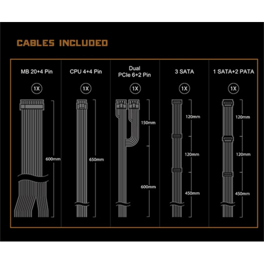 | DUAL PCIe 6+2pin Konektor | 2x / 2x (600 + 150 mm) |