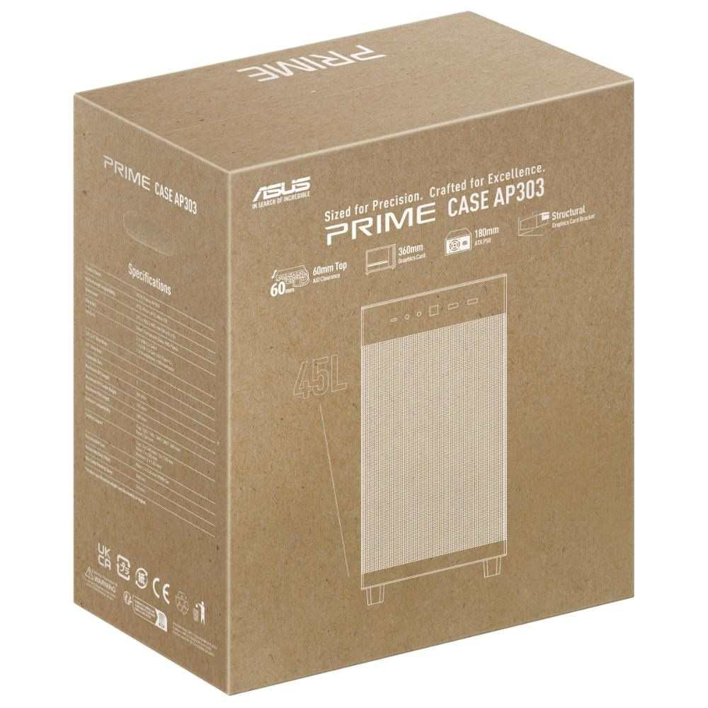 ASUS Prime AP303 je kompaktní ATX skříň o objemu 44 litrů, která podporuje grafické karty až do délky 360 mm, radiátory až 360 mm a tloušťky do 60 mm a ATX zdroje o délce až 180 mm.