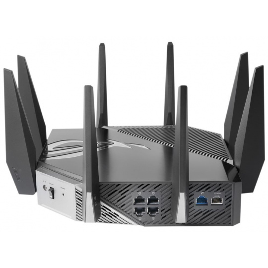ROG Rapture GT-AXE11000 Třípásmový herní router GT-AXE11000 WiFi 6E (802.11ax), nové pásmo 6 GHz, 2.5G WAN/LAN port, kompatibilní s PS5, agregace WAN, VPN Fusion, tříúrovňová herní akcelerace, zabezpečení sítě zdarma a podpora AiMesh Standard WiFi nové generace – první třípásmový WiFi 6E router na světě zvyšuje rychlost až 11 000 Mb/s. Nové pásmo 6 GHz – Širší kanály a vyšší kapacita přinášejí vyšší výkon, nižší latenci a menší rušení. 2.5G WAN/LAN Port – Veškerý síťový provoz procházející přes 2.5G port má nejvyšší prioritu a 2.5G port tak dokáže plně využít potenciál WiFi 6. Výkon díky dokonalé technice – Čtyřjádrový procesor, pokročilý chladicí systém a optimalizovaný design antény přinášejí výpočetní schopnosti na zcela nové úrovni. Tříúrovňová herní akcelerace – Zrychlete přenos herních dat na každé zastávce, od vašeho zařízení až po herní server. RJ45 for Gigabits BaseT for WAN x 1, RJ45 for Gigabits BaseT for LAN x 4, RJ45 for 2.5G BaseT for WAN/LAN x 1 ROG Rapture Wifi 6 802.11ax Tri-band Gigabit Gaming Router Wifi 6 802.11ax 1148Mbps (2.4G) Wifi 6 802.11ax 4804Mbps (5GHz) Wifi 6E 802.11ax 4804Mbps (6GHz) OFDMA + MU-MIMO tech, 1024 QAM, Triple level Game Acceleration, Aura RGB lighting, ROG Boost Key, 2.5G Multi-Gigabit Gaming Port, WiFI Radar and Zero Wait DFS, AiProtection Pro, VPN Fusion Adaptive QoS, Bandwidth control, AiMesh, ASUS Roter APP (ROG theme).