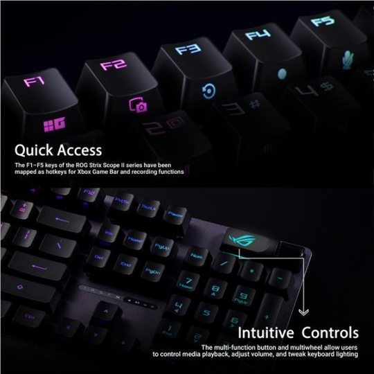 Herní klávesnice ROG Strix Scope II s předem namazanými mechanickými spínači ROG NX Snow a NX Storm, pěnou tlumící zvuk, dvojitými krytkami kláves PBT nebo ABS s UV povlakem, klávesovými zkratkami pro streamování, multifunkčními ovládacími prvky, třemi úhly sklonu a opěrkou zápěstí