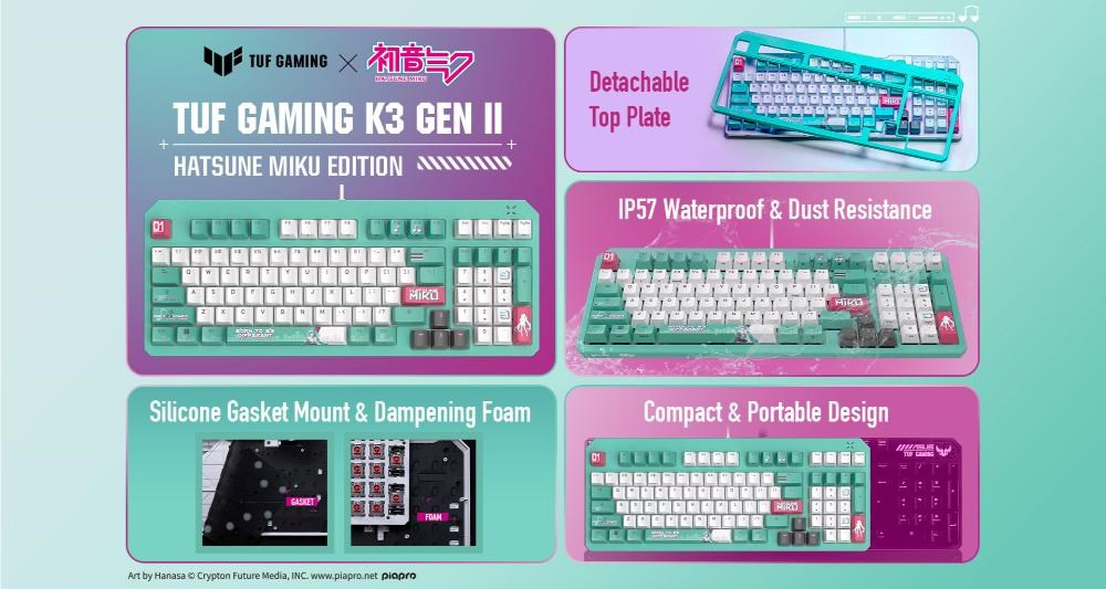 Klávesnice ASUS TUF Gaming K3 Gen II Hatsune Miku Edition s kompaktním rozložením 97 kláves, opticko-mechanickými spínači RGB, silikonovým těsněním, tlumicí pěnou, voděodolností IP57, odnímatelnou horní deskou a kompatibilitou s technologií Aura Sync.