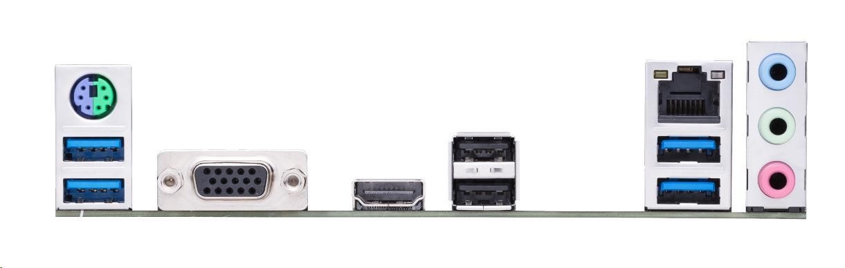 | Back I/O Ports | 1 x PS/2 keyboard/mouse combo port(s) 1 x D-Sub 1 x HDMI 1 x LAN (RJ45) port(s) 4 x USB 3.2 Gen 1 (blue) Type-A 2 x USB 2.0 3 x Audio jack(s) |