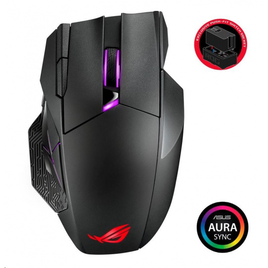 - Complete command in battle - Get into the fight with ROG Spatha X. This wireless gaming mouse features dual-mode connectivity, allowing you to play wirelessly via RF 2.4 GHz or traditionally with a wired USB-C® connection. A specially tuned 19,000 dpi sensor lets you take down opponents swiftly with extreme accuracy, while 12 programmable buttons ensure all commands are at your fingertips. In addition, ROG Spatha X features exclusive push-fit switch sockets, ROG Micro Switch, Aura Sync RGBs, and a magnetic charging dock.
