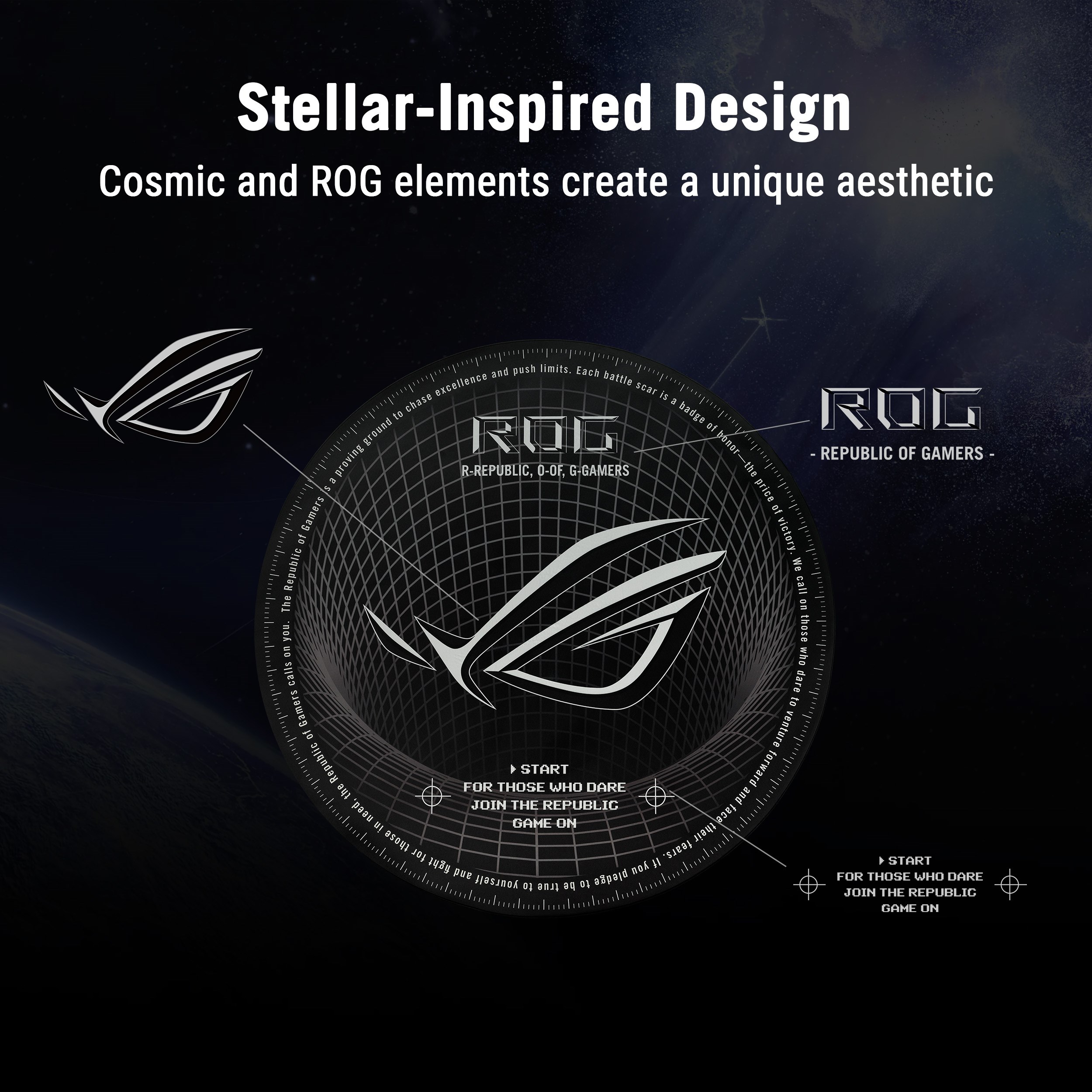 ROG Cosmic Mat II je herní podložka, která kombinuje design inspirovaný hvězdnou oblohou s ikonickými prvky ROG a vytváří tak dojem hloubky a vrstevnatosti připomínající rozlehlý vesmír. Je vyrobena z jerseyové tkaniny, snadno se čistí a udržuje, a díky protiskluzové gumové základně zajišťuje stabilitu a odolnost. Je to skvělá volba pro hráče, kteří hledají styl a funkčnost.