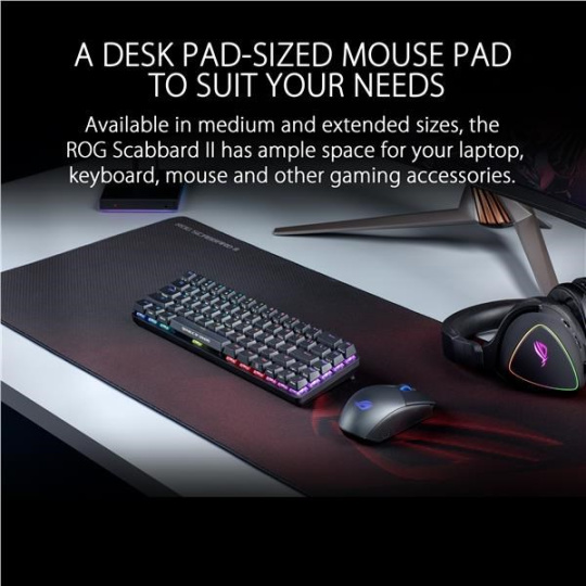 ROG Scabbard II extended gaming mouse pad with protective nano coating for a water-, oil-and dust-repellant surface, with anti-fray, flat-stitched edges and a non-slip rubber base