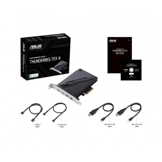 | Accessories | 2 x mini DisplayPort cables (links graphics output from motherboard’s or discrete graphics card’s DisplayPort to the mini DisplayPort IN port on the ThunderboltEX 4 card) 1 x USB 2.0 cable 1 x 14-1 pin Thunderbolt header cable 1 x User manual 1 x Support DVD with Thunderbolt™ driver |