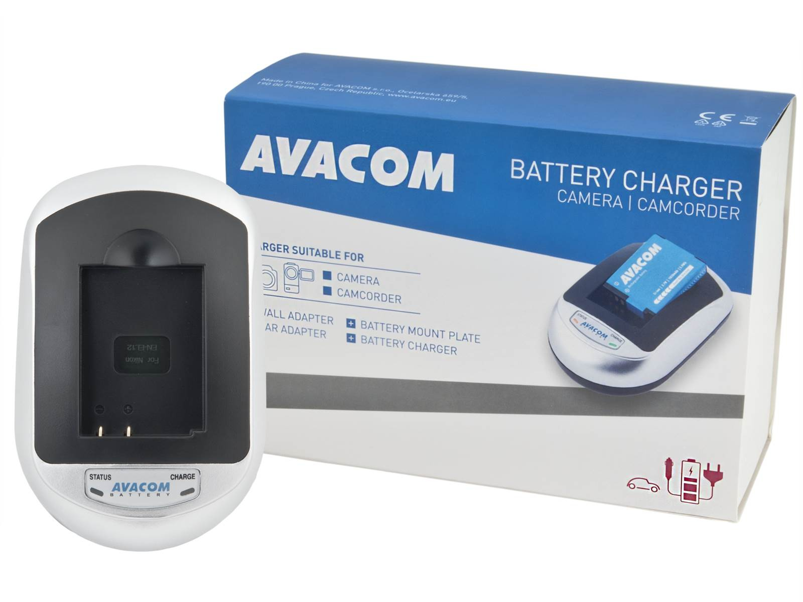 Balení obsahuje: nabíjecí základnu, redukci AVP, síťový adaptér na 100 - 240V, 12V autoadaptér do zapalovače, návod k použití.