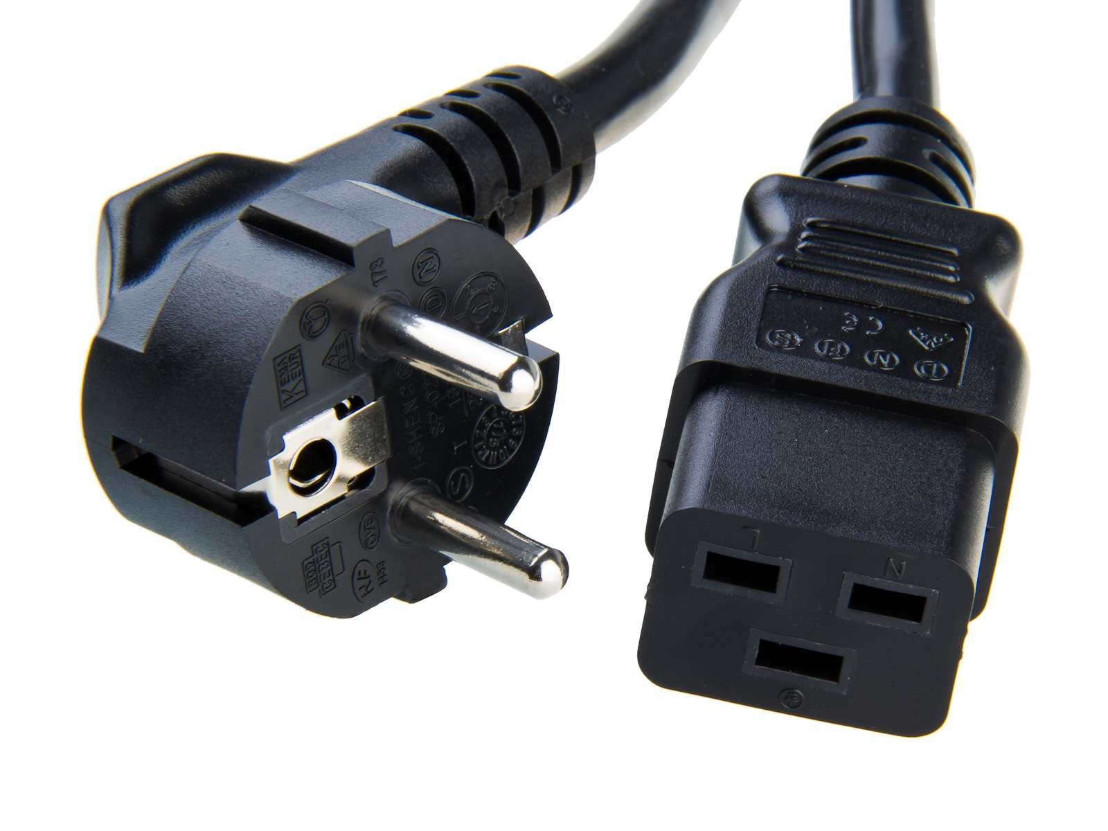 Napájecí síťový kabel 16A (IEC320-C19) Kabel 3 x 1,5mm2, 2m, černý Konektory EU 230V 3pól(M) -> PC 230V 16A(F).