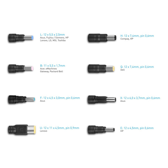 Univerzální nabíjecí adaptér pro notebooky AVACOM QuickTIP 150W dokáže se svými 8 různými konektory napájet většinu notebooků a herních notebooků oblíbených značek Acer, Asus, Compaq, Dell, Fujitsu/Siemens, Gateway, HP, LG, Lenovo, MSI, Packard Bell, Toshiba, eMachines i jiných zařízení, vyžadujících napájení ze sítě.