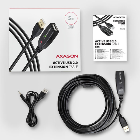 Aktivní prodlužovací USB 2.0 kabel AXAGON ADR-205 délky 5 metrů. USB repeater kabel zesiluje průchozí USB signál a umožnuje připojit výrazně vzdálenější USB zařízení než obvyklých 5 metrů při použití pasivních kabelů. Možnost spojit několik repeater kabelů za sebou.
