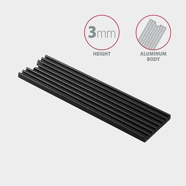 Žebrovaný hliníkový chladič vysoký 3 mm, napomáhá lepšímu odvodu tepla vzniklého při provozu M.2 SSD disku a umožňuje tak snížit teplotu disku až o 15 °C. Prodlužuje se tak životnost M.2 SSD disku a zamezí se zpomalování rychlosti disku tzv. „Thermal Throttling“.