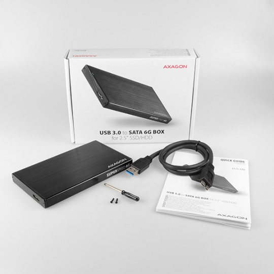 Kompaktní hliníkový externí box AXAGON EE25-XA6 ALINEbox s USB 3.2 Gen 1 (USB 3.0) rozhraním určený pro 2.5" SATA pevné disky nebo SSD.