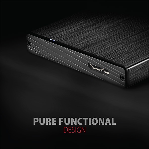Lehký a zároveň odolný odlitek hliníkové skříně pro dokonalou mechanickou ochranu disku a výborný odvod tepla. Decentně tvarovaná skříň s kartáčovaným povrchem zaručuje elegantní styl a brání nežádoucím otiskům prstů.