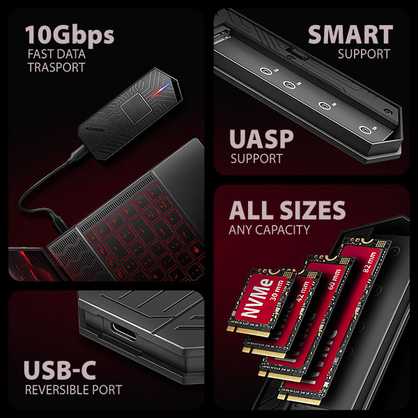 Unikátní vlastností, díky použitému čipsetu, je možnost použití jak M.2 NVMe tak i SATA disků. Nemusíte tak přemýšlet jaký typ M.2 disku do boxu vložíte. Výhodou je uchycení rovnou pro čtyři různé délky SSD karet – 30, 42, 60 a 80 mm. M.2 karty mohou být jednostranné nebo oboustranné. Box nemá omezení kapacity vloženého SSD disku.