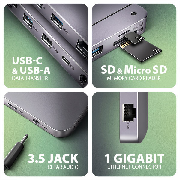 Elegantní hliníkové tělo zajistí nejen mechanickou odolnost, ale i pasivní chlazení. O aktivní chlazení se postará tichý integrovaný ventilátor, který chladí jak M.2 disk tak samotné tělo hubu. Potěší také jemně strukturovaný povrch, na kterém nezůstávají otisky prstů. Replikátor portů je ideálním doplňkem pro notebooky s nedostatkem USB konektorů, paměti anebo video výstupů. USB-C kabel o délce 50 cm je odpojitelný a lze jej tak v případě potřeby nahradit delším kabelem.