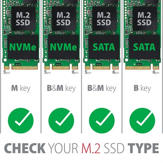 Adaptér podporuje použití SATA i NVMe (PCI-Express) M.2 SSD disků, jednostranných i oboustranných. Redukce nemá omezení kapacity SSD disků a lze použít M.2 karty všech rozměrů až do délky 110 mm. Samozřejmostí je fungování obou disků zároveň.