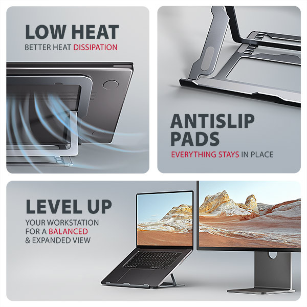 Podstavec je vyroben z hliníkových odlitků garantujících dlouhou životnost a spolehlivost. Díky protiskluzové úpravě se nemusíte obávat nežádoucích pohybů – vaše zařízení zůstane pevně na svém místě, a to bez poškození povrchu notebooku či podložky. Tyto pečlivě navržené vlastnosti zaručují perfektní stabilitu pro váš notebook, tablet nebo dokonce oblíbenou knihu, což vám poskytne klid a pohodlí při každodenním používání.