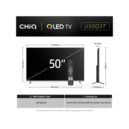 CHiQ 50“ U50QST, ultratenká metalická bezrámečková QLED Smart Google TV 5.0 s několika herními funkcemi, HDR10, HLG, obrazovkou s Ultra HD s rozlišením 3840 x 2160 pixelů, prostorovým zvukem Dolby Audio a dbx-tv.