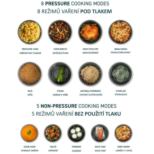 - Tlakové vaření, rýže, pára, ovesné vločky/kaše, dušené maso/vývar, fazole/zrno, maso/drůbež, jogurt, koláč, pomalé vaření, soté, Sous Vide, udržování teploty